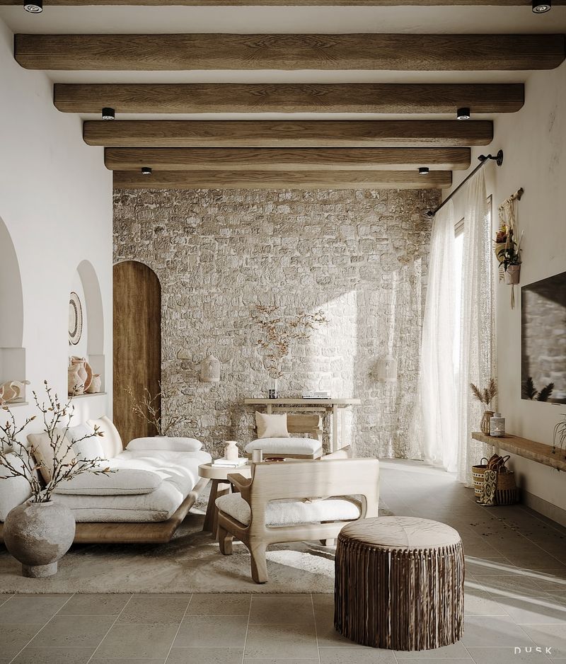 This image perfectly captures the serene harmony of raw, natural materials. We see rough-cut wooden ceiling beams balancing the beautiful texture of a stone or exposed brick wall, all contrasted with the soft, cream-colored, low-slung sofa and chair. The use of natural light filtering through sheer curtains and the presence of a few simple, organic vases and a fringe-detailed ottoman bring an immediate sense of quiet calm.