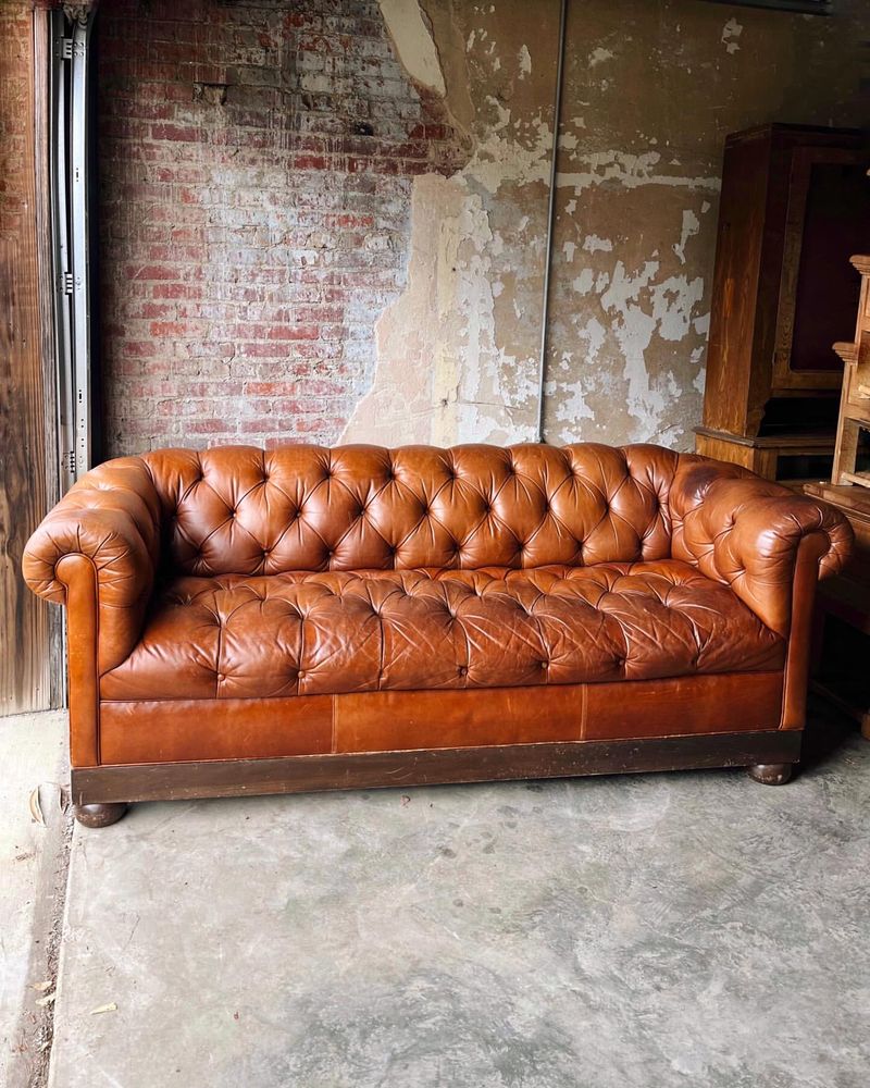 Here we see a gorgeous, deep cognac leather chesterfield sofa that has clearly lived a full life. The tufting is pronounced, and the leather shows the wrinkles, variations, and patina of age, set against a backdrop of exposed brick and distressed plaster. The floor is industrial concrete, and the setting suggests a reclaimed, artistic, or loft-style space.