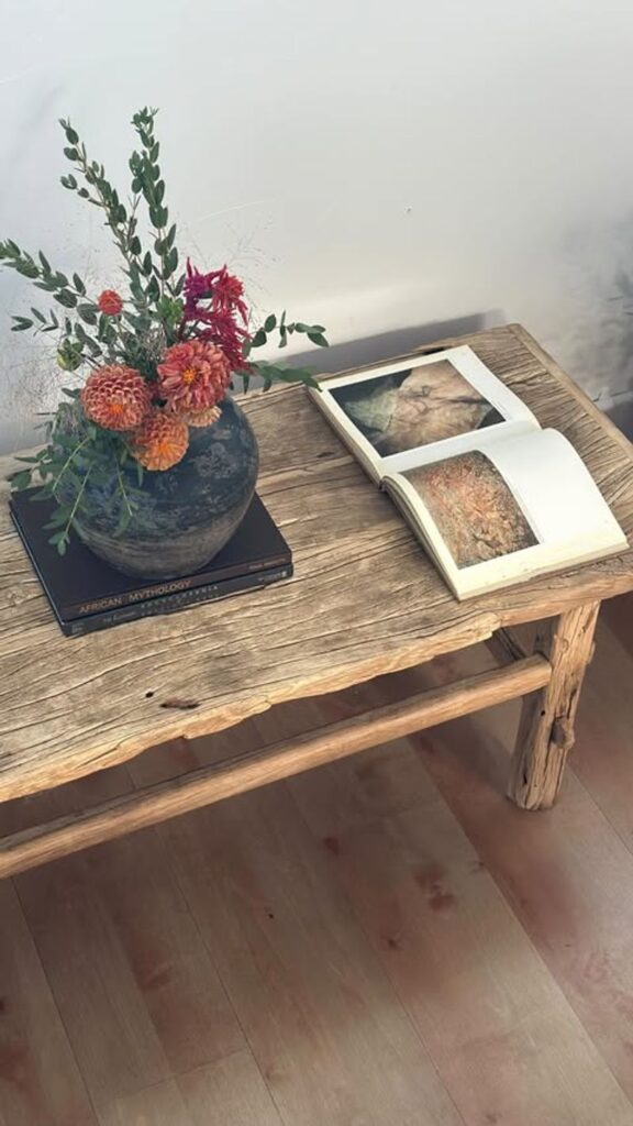 This image highlights a close-up of a small, rectangular coffee table or bench made from heavily distressed, natural wood. The grain is pronounced, the surface is rough, and the structure is visibly simple. It’s styled with a dark, low-slung vase holding deep orange flowers and green foliage, along with a few thick books laid open.