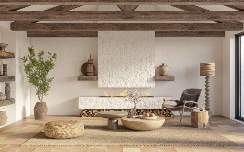 This beautifully balanced living room features robust dark wood beams across the ceiling and an incredible white fireplace with deeply textured, rough-hewn plaster. A horizontal firebox sits above a storage space for split logs, and the furniture is low-slung, featuring natural materials like a woven pouf and round, wooden coffee tables.