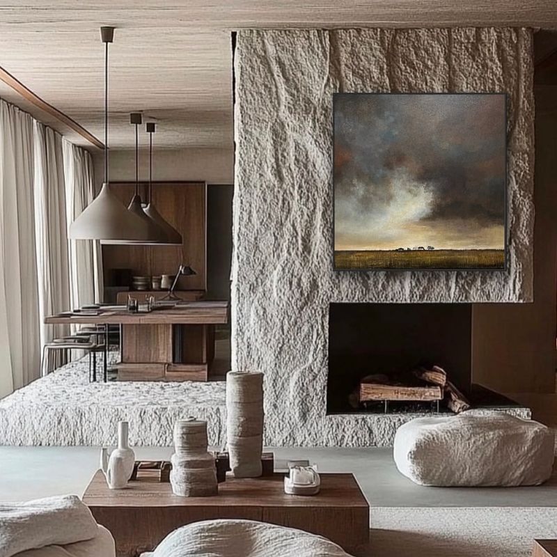 The visual impact is created by the large-scale texture of the artwork, which instantly draws the eye and emphasizes raw, tactile quality over complexity. This space feels incredibly serene, sophisticated, and grounded by the horizontal lines and earthy tones. Seek out large-format abstract art or canvases with heavy, visible texture in neutral shades to anchor your main wall.