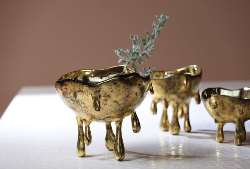 The design works because it incorporates an element of luxury (gold) but presents it in a way that is utterly imperfect, cracked, and flowing—it’s gold with soul. This playful, slightly surreal aesthetic adds a touch of whimsical antiquity to the space. Look for accessories that look like they’ve been handcrafted or imperfectly finished, even if they feature metallic elements.