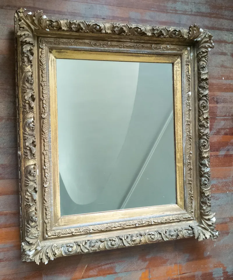 Showcased here is a large, square mirror in a heavy, highly ornate gold frame with visible signs of wear, including chipped paint and distressed detailing. The mirror is leaning casually against a wall with textured, aged wood paneling in muted, earthy tones.