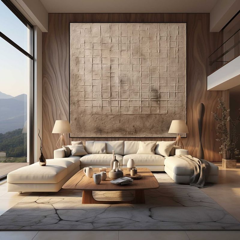 This bright and airy living room features a huge, monolithic piece of art with a highly textured, grid-like pattern, hung on a paneled wood wall. The seating is a modern, light cream sectional sofa with minimal lines, accessorized with simple vases and a chunky wood coffee table.