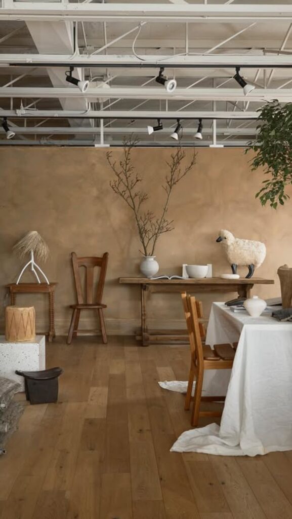 This eclectic space mixes a variety of natural elements and simple furniture forms. We see a rustic dining or console table holding a vase with bare branches, a chunky, humble wooden chair, and an adorable sheep figurine. The wall is a soft, earthy brown plaster, and the ceiling shows industrial piping.