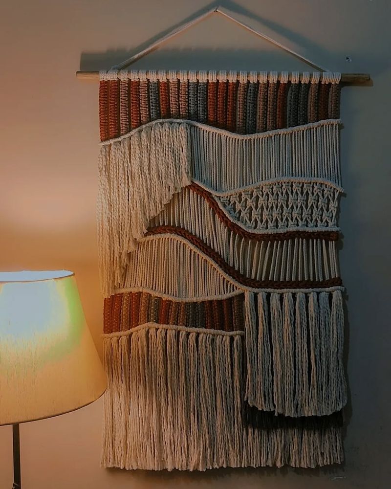 A close-up of a large, beautiful macrame wall hanging is featured, showcasing varied weaving techniques, textures, and neutral colors (cream, beige, rusty terracotta). The raw rope hangs down in fringe at different lengths, creating an organic, wavy pattern.