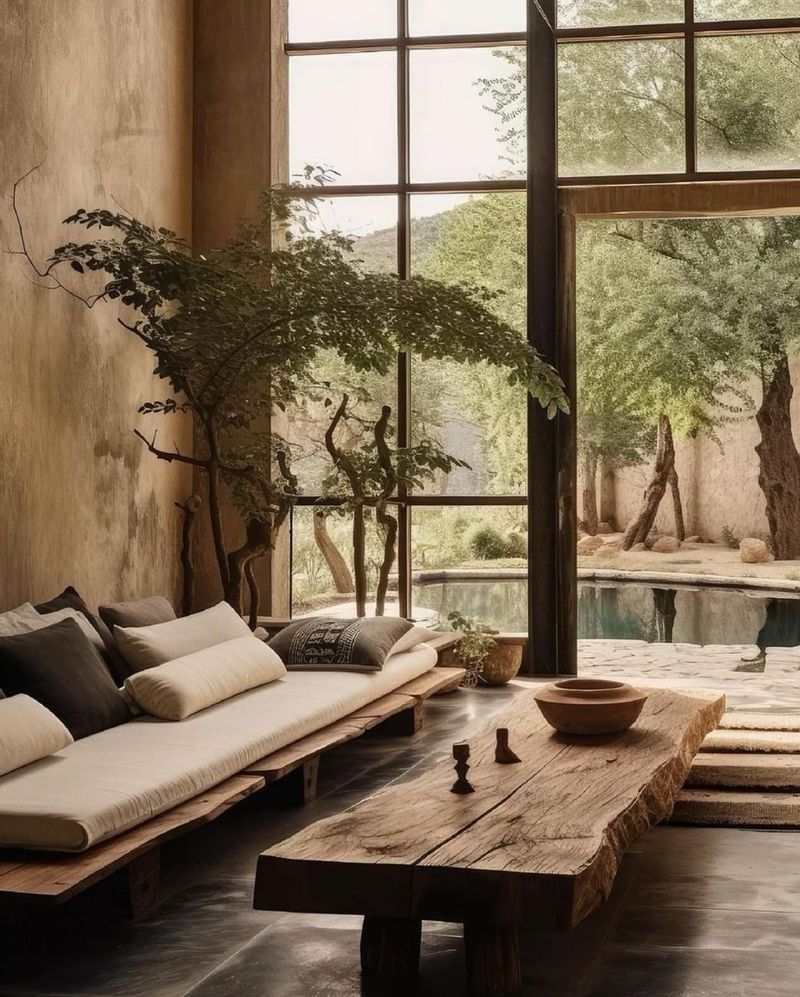 The design emphasizes connection to nature, using the deep, dark floor and the heavy, unrefined wood elements to feel intensely grounded. The low height of the furniture forces a more relaxed, reflective posture, creating a mood of deep tranquility and Zen retreat. Opt for floor seating or platforms rather than tall sofas to bring the eye level down and enhance the feeling of being close to the earth.