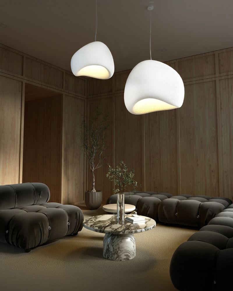 A deeply textured, mood-driven room with wood-paneled walls and low, rounded seating in a dark, warm fabric is shown here. The main feature is the pair of large, cloud-like pendant lights with an uneven, organic shape and a textured white surface.