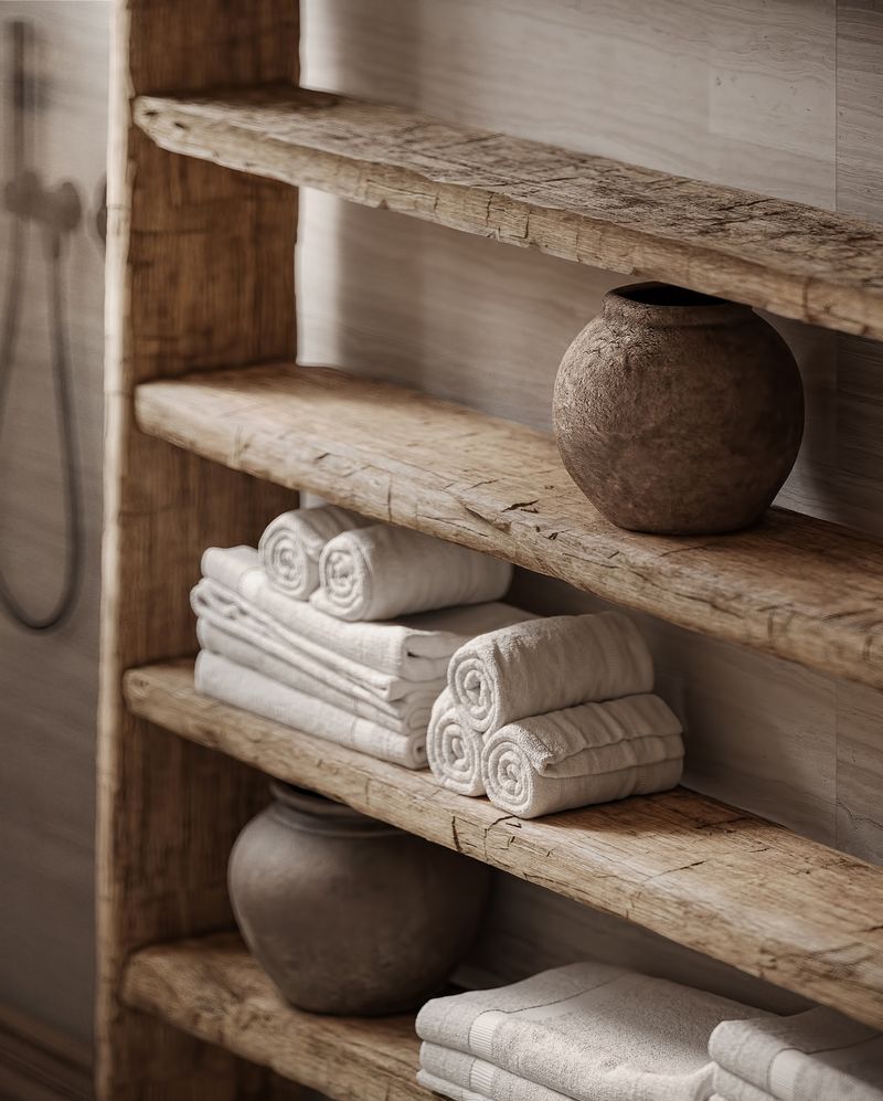 While this appears to be a bathroom detail, the concept applies everywhere. It features three rough-hewn, thick wooden shelves with visible cracks and grain. They are minimally styled with rolled white towels and two earthy, dark ceramic vessels, emphasizing utility and material authenticity.