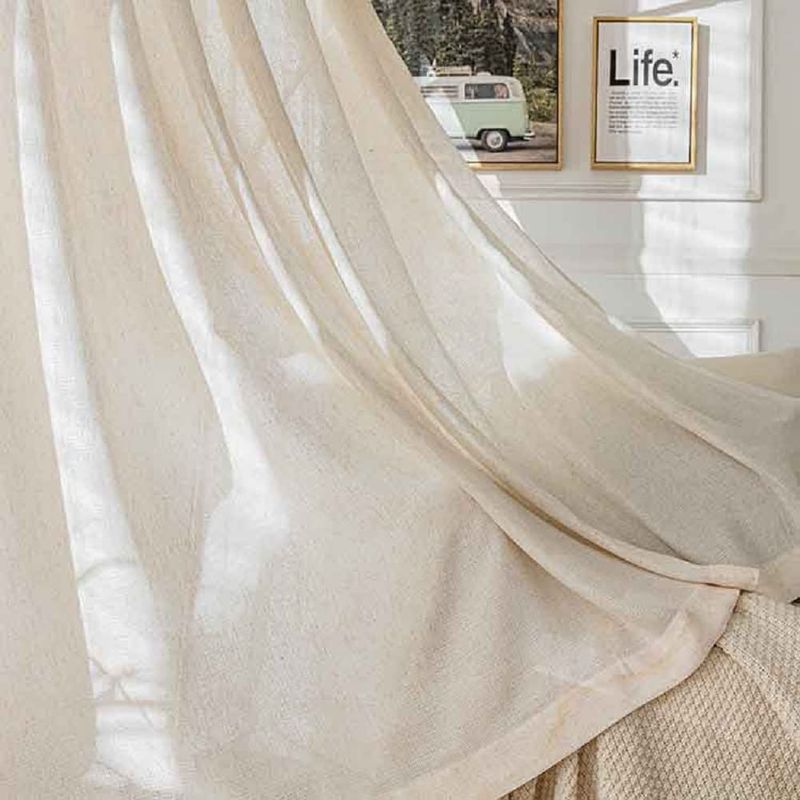 This close-up focuses on the rich texture and effortless drape of sheer, unbleached linen curtains. The fabric is light and slightly textured, allowing light to filter softly into the room, obscuring the view just enough to create privacy.