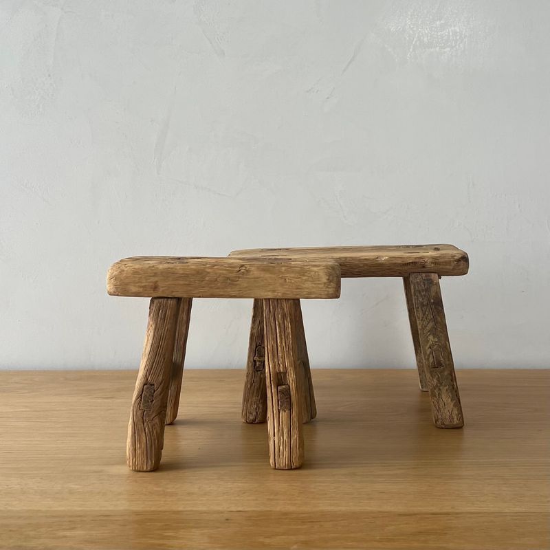 This image captures two small, primitive-style wooden stools sitting side by side on a light wood surface, against a textured white wall. The stools are clearly handmade, with uneven legs, visible joinery, and a worn patina.