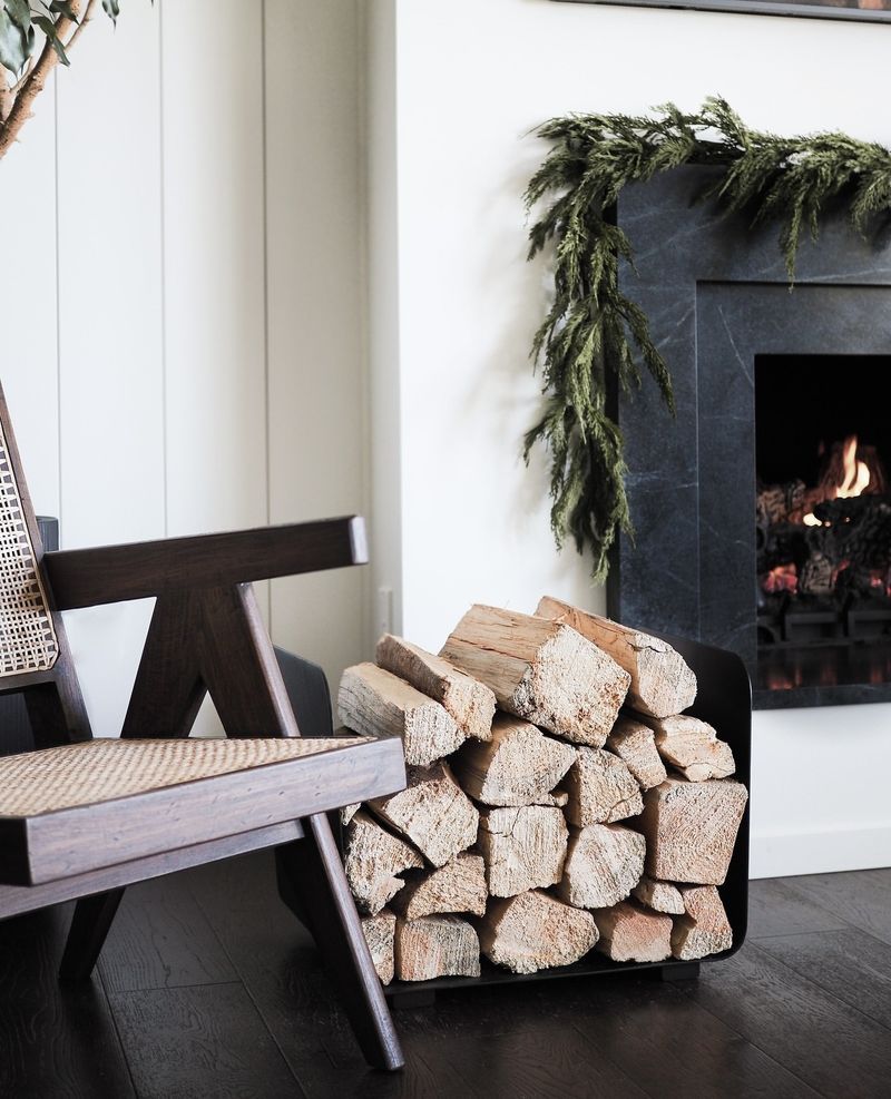 This cozy detail features a stack of neatly cut firewood resting in a simple black holder beside a dark stone fireplace, which is adorned with a simple green garland. A wooden chair with a cane seat is visible in the foreground.