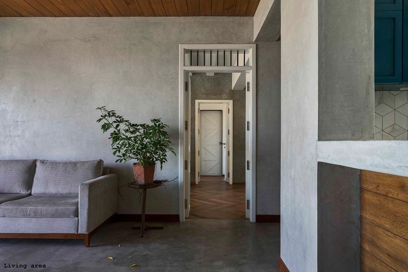 This view of a living area shows soft, light-gray concrete or plaster walls, contrasting with warm, dark parquet flooring and a wood ceiling. A simple, comfortable sofa and a single potted plant are visible in the corner. The focus is on the long hallway leading into the space, which is framed by simple white doorframes.