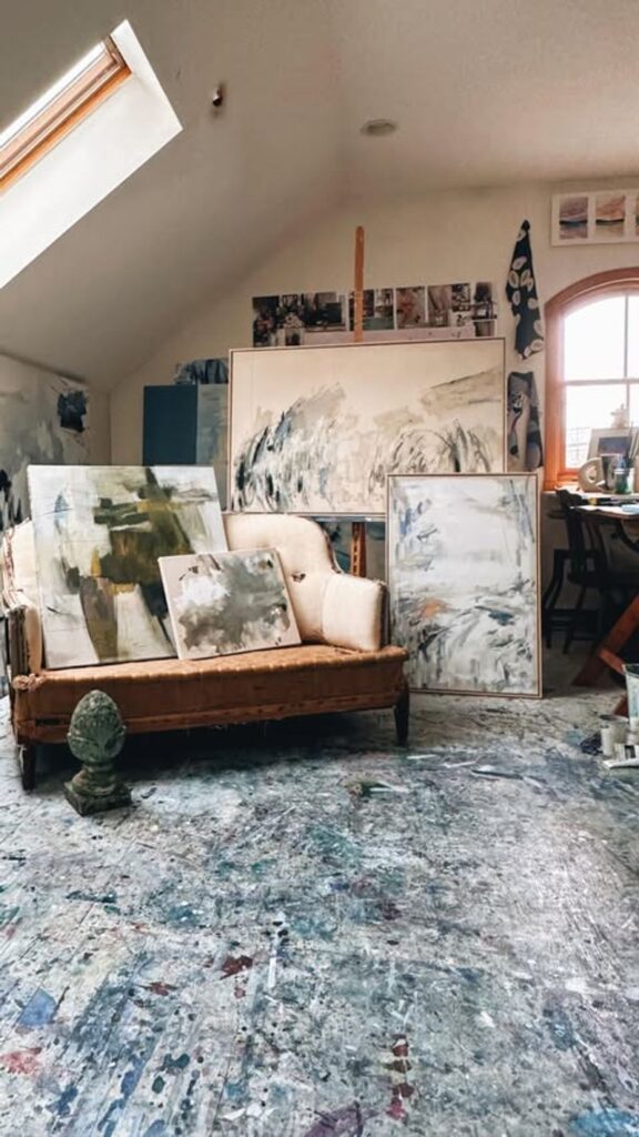 Captured here is an artistic space that feels raw and authentic, possibly a painter’s studio used as a living area. The floors are visibly splashed with paint, large, moody abstract canvases lean casually, and a small, worn antique sofa sits in the center. Natural light streams in from the skylight and window.