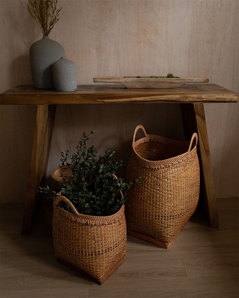 This close-up features two large, handwoven rattan or wicker baskets sitting under a live-edge wooden console table. One basket holds lush greenery. The scene is lit softly, emphasizing the texture of the woven material and the natural grain of the wood.