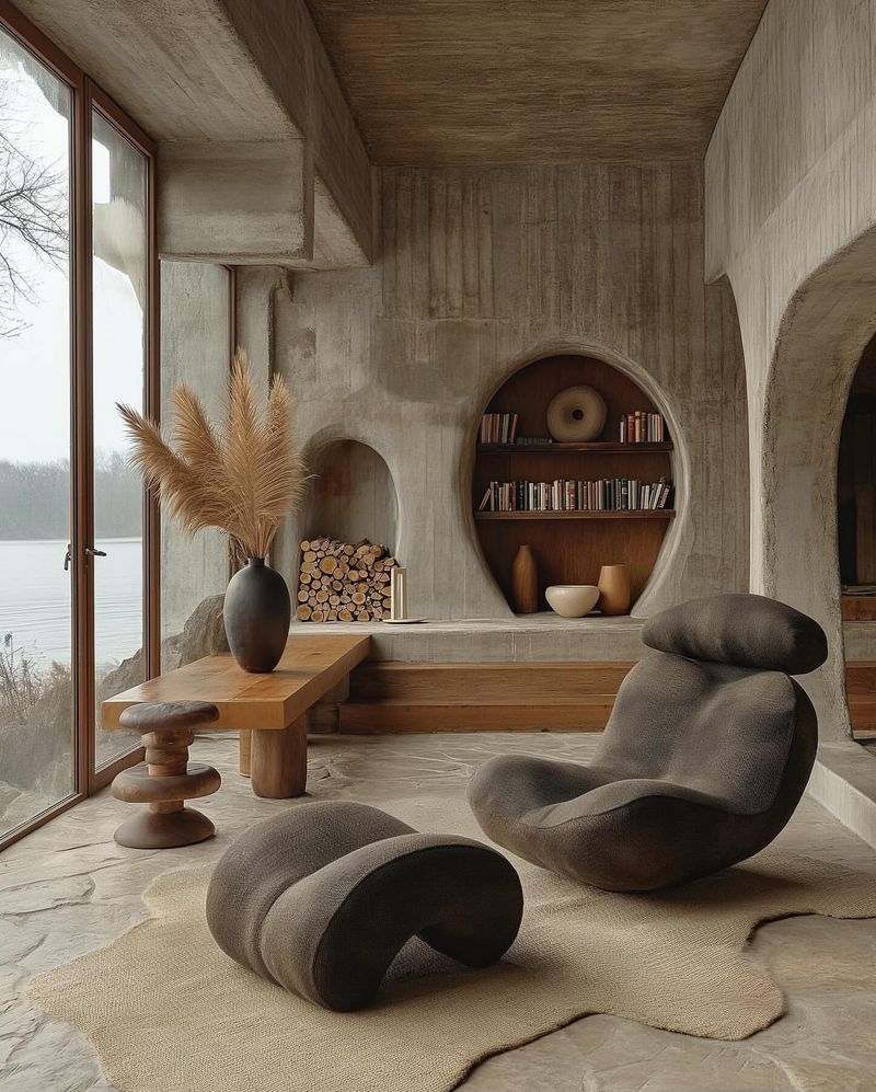 This incredible space showcases heavy, textured concrete walls and a stone floor, characteristic of Brutalist architecture, softened by organic elements. A rounded, upholstered chair, a low wooden table, and dried pampas grass in a dark vase are featured. A circular bookshelf is recessed into the wall.