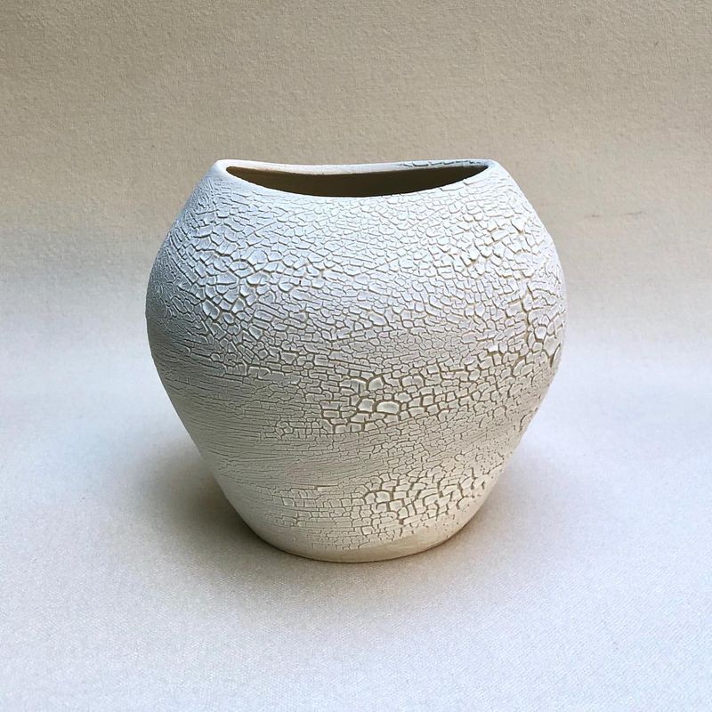 This close-up focuses on a single, white ceramic vase with a mesmerizing, crackled, highly textured surface (possibly raku or a crazed glaze). The form is slightly irregular and rounded.
